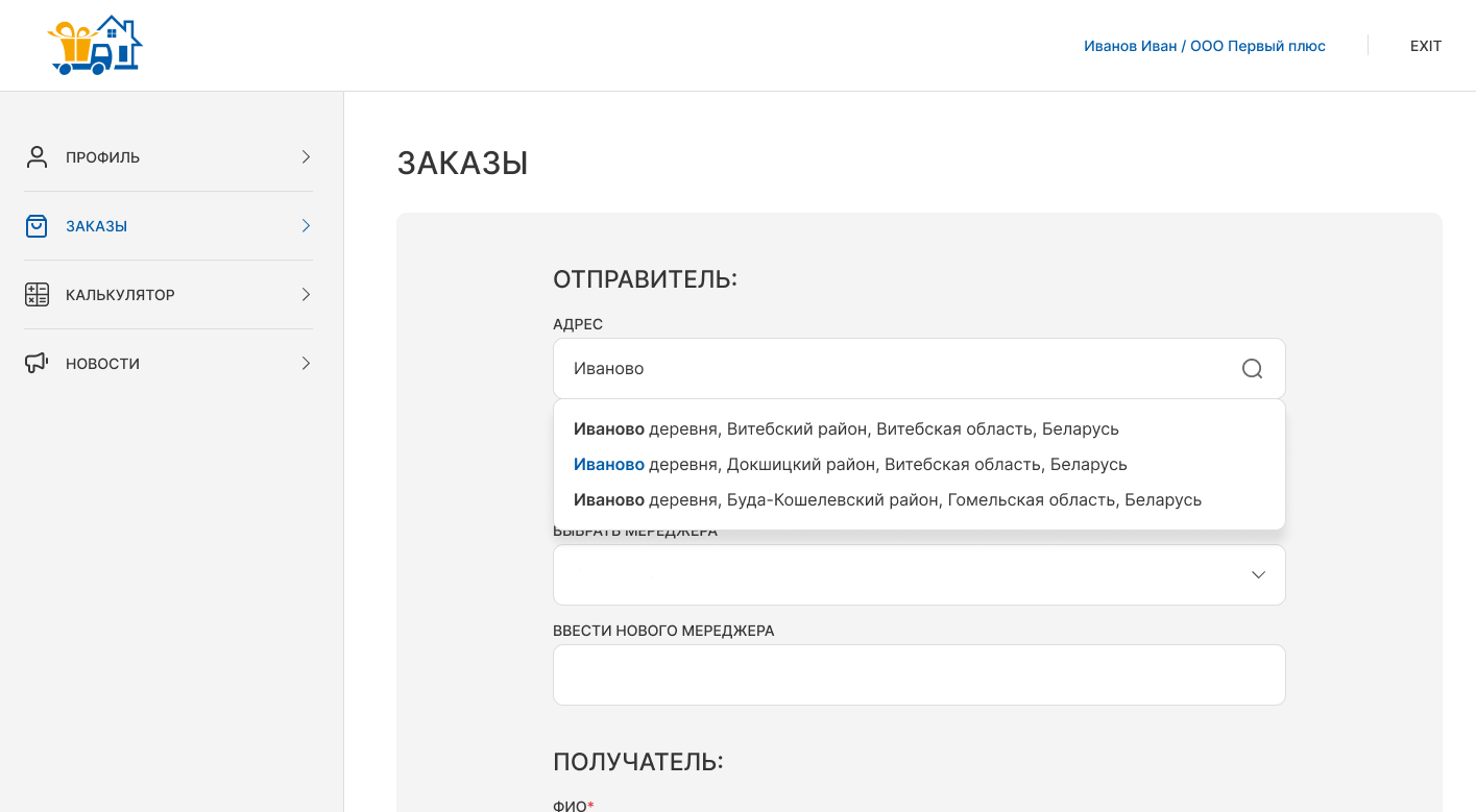 - Разработан удобный и простой интерфейс для ввода данных о заказе, включая информацию о грузе, адреса отправителя и получателя